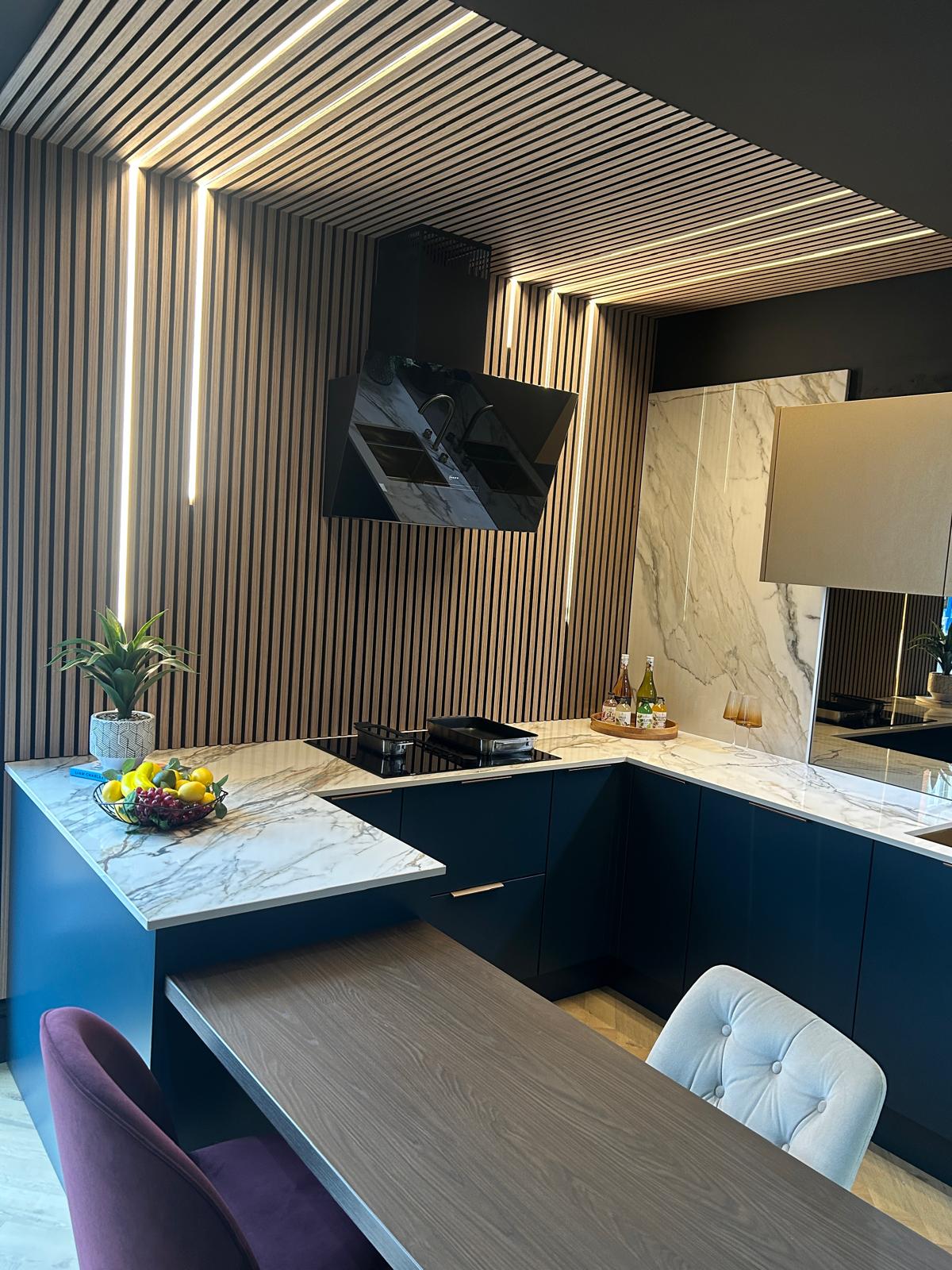 We recently completed this stunning LED lighting installation at the Kitchen Depot showroom in Stony Stratford — perfectly integrated into the acoustic slat panels to create a sleek, modern ambience.